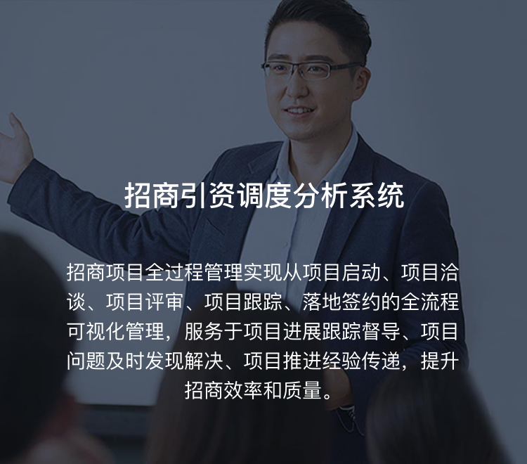 招商项目全过程管理实现从项目启动、项目洽谈、项目评审、项目跟踪、落地签约的全流程可视化管理,服务于项目进展跟踪督导、项目问题及时发现解决、项目推进经验传递,提升招商效率和质量。